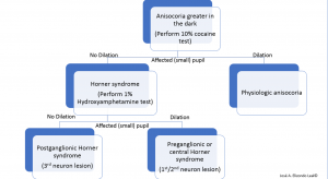 Examination may demonstrate anisocoria that is more pronounced in the dark (with dilation lag), due to impairment of the oculosympathetic pathway. Mild ptosis and upside down ptosis of the ipsilateral eye may be present due to the involvement of the sympathetic innervation to Müller’s and Horner’s muscles. Palpation of the head and face may reveal sensory deficits. Careful neurological exam, including extraocular movements, corneal reflex, and facial sensation could be considered in order to undercover any other cranial nerve involvement.