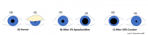 Either 1% or 0.5% apraclonidine, an alpha-1 and alpha-2 adrenergic receptor agonist may be used. Under normal circumstances, the alpha-2 agonist effect in the pre-synaptic membrane will predominate. In contrast, if oculosympathetic denervation is present, there will be a supersensitivity that will allow the post-synaptic alpha-1 agonist action to predominate, leading to pupillary dilation of the affected eye with mild constriction of the normal pupil; this can produce a relative reversal of anisocoria and confirms a Horner syndrome pharmacologically. Alternative topical diagnostic tests for Horner syndrome include cocaine and hydroxyamphetamine (Figure 2).