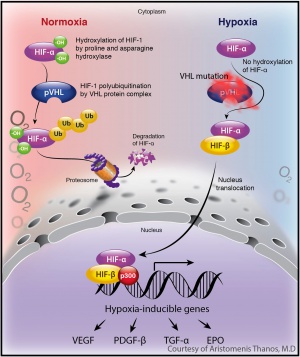 VCB- CUL2 complex. This protein complex plays an important role in the ubiquitin-mediated degradation of intracellular proteins through the proteasome. Under normoxic conditions, the VHL protein complex binds to, and targets, the alpha subunits of hypoxia-inducible factors (HIF) 1 and 2 for ubiquitin-mediated degradation by the proteasome. HIF1a and HIF2 are potent transcriptional factors that are important for the cellular response under hypoxic conditions, since they enhance glucose uptake and increase expression of angiogenic, growth, and mitogenic factors including vascular endothelial growth factor (VEGF), platelet derived growth factor (PDGF), erythropoietin (EPO) , and transforming growth factor (TGF).[13]