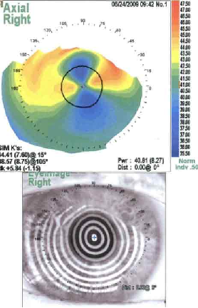 The diagnosis of SND is usually made clinically. A slit lamp exam can show the characteristic gray, white, or bluish nodules posterior to the corneal epithelium.[9] These nodules can occasionally stain with fluorescein (Figure 2).[3] Corneal topography can reveal significant irregular astigmatism occurring as a result of Salzmann nodules (Figure 3).[9]