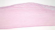 Light microscopy (Figure 1) reveals dense deposits of hyalinized, irregularly arranged collagen fibers anterior to a fragmented and sometimes absent Bowman membrane.[1][12] The tissue overlying the Salzmann nodules displays an attenuated epithelium containing only 1 or 2 layers of discontinuous, elongated basal cells, in addition to 2–3 more hyperchromatic layers above it.[1][12] The corneal stroma contains unevenly distributed keratocytes and disorganized collagen bundles. The keratocytes seen in the nodular stroma have not been shown to be mitotically active; rather, they resemble activated fibroblasts or myofibroblasts of the anterior stroma during corneal repair.[1] Morphometric analysis yields a thinned corneal epithelium (2- to 4–fold) overlying the Salzmann nodules.[1]