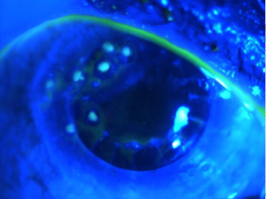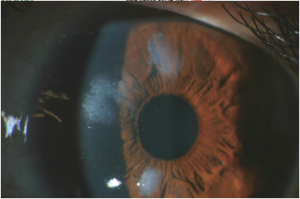 These patients usually present with gradual, painless loss of vision—both near-vision and distance-vision.[9] They may or may not have a history of chronic ocular surface disease such as that described above. Patients may also complain of a “foreign body sensation” on the surface of their eye.[4] Slit lamp exam can reveal white to bluish-grey nodules within the cornea (Figure 4).[4]