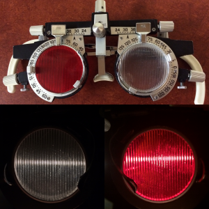 Place the red filter on the patient’s preferred eye while they fixate on a target or light, typically at distance. Ask the patient to describe where they see the red version of the fixation target relative to the normal appearing version of the fixation target.