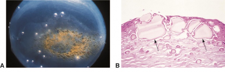 The clinical appearance is characterized by the presence of yellow or golden spherules or “droplets” at or beneath the corneal or conjunctival epithelium. The lesions are located in the superficial corneal stroma, Bowman’s membrane, subepithelium, and rarely in the epithelium in the advanced stage of the disease. Depending on the location and the etiology of the lesions, the clinical features have been categorized into three forms by Fraunfelder FT and colleagues[5][8]: