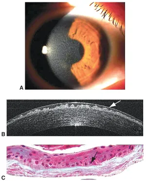 Reveals irregular reflective deposits within Bowman’s layer and epithelium.[3] The reflective material in Bowman’s layer is irregular, while deposits in the basal epithelium are more homogeneously reflective with round edges and dark shadowing.[3]