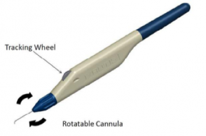 The delivery system is designed for use with either the right or left hand and possesses a rotatable sleeve for alignment of the cannula according to surgeon preference. Once this preference has been set, a 1.5 mm long clear corneal incision is made. The preloaded injector is placed through the wound, and the cannula tip is advanced through the TM until it enters Schlemm’s canal, and the bevel is flush against the entry point in the TM. The target tissue is then visualized using gonioscopy. Once the distal cannula tip is confirmed to be properly positioned, the tracking wheel is used to advance and release the microstent. Following injection, the device occupies about three clock hours, or 90 degrees, of Schlemm’s canal, and has a 1 mm inlet portion that resides within the anterior chamber.[8]