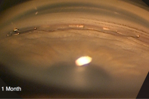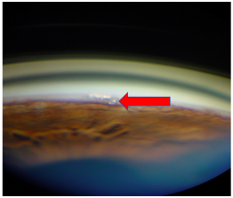 Hyphema can be observed intraoperatively and early postoperatively.[17][18] It is often secondary to blood refluxing through the iStent. It is not regarded as a serious complication (but can hinder the view in surgery and should be cleared with viscoelastic injections before proceeding with the procedure) and can rather be an indication that the distal pathway is patent. The hyphema itself tends to resolve within days-week after the procedure and may affect visual acuity until its resolution.