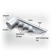 The first generation iStent was FDA approved in 2012. Its dimensions are 1mm x 0.33mm x 120 microns . It is made of surgical grade nonferromagnetic heparin-coated titanium, featuring three retention arches, promoting stable placement within the TM. The inserter system functions as a preloaded single use inserter with a rotator grip . There are two versions for left and right-handed surgeons. The device features a self-trephining tip that facilitates access into the TM via a sideways sliding technique.