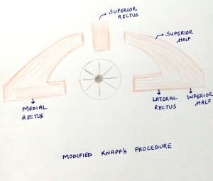 Knapp’s procedure is indicated in patients of monocular elevation deficiency. In this procedure the horizontal recti (both medial and lateral recti) are disinserted full width and transposed superiorly.[36](Figure 12)
