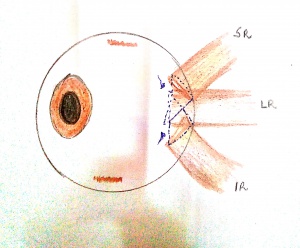 Technique: A limbal based incision is made which helps for better exposure of the vertical recti. Non-absorbable sutures (6-0 polypropylene or ethibond sutures) are passed incorporating the temporal 1/3 of the vertical recti at a distance of 8 to 10 mm behind the insertion points of the vertical recti. The sutures can be tied there to avoid muscle breakage due to tension during transposition. The same suture is then passed through each scleral wall at a distance of 10 to 12 mm behind the supero-temporal and infero-temporal limbus. The temporal margin of each vertical rectus is then transposed and anchored onto the sclera. (Figure7)
