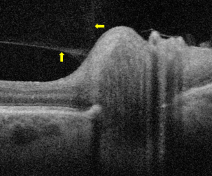 The presence of vitreopapillary traction was historically assessed by ophthalmoscopy and dilated slit lamp microscopy. Advanced non-invasive imaging techniques such as OCT have allowed for better morphologic characterization of the posterior hyaloid, retina and vitreopapillary interface. In vitreopapillary adhesion and traction, OCT findings may include optic disc elevation, retinal nerve fiber layer thickening, PVD with a thickened, hyperreflective posterior hyaloid attached to the optic disc or optic disc margin.[3][11][13]